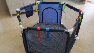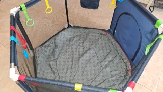 Parque infantil en buen estado, ideal para que los más pequeños jueguen de forma segura. Incluye varios juguetes colgantes. - Estructura de tela y tubos. - Puerta de acceso. - Juguetes de colores colgantes.