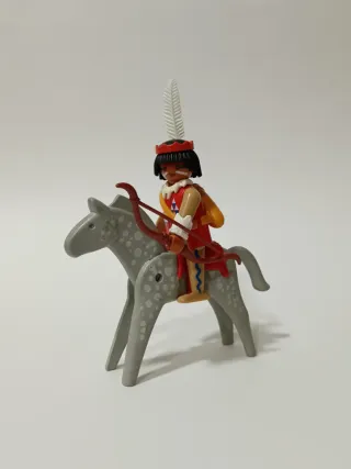 Figura de Playmobil de un indio a caballo, listo para la aventura. Incluye accesorios. - Figura de indio con vestimenta tradicional. - Caballo gris con manchas. - Escudo con diseño tribal. - Arco y flechas. - Pluma decorativa en la cabeza. Tal y como se muestra en las imágenes. Se hacen envíos por wallapop o por correo ordinario, se agrupan pedidos.