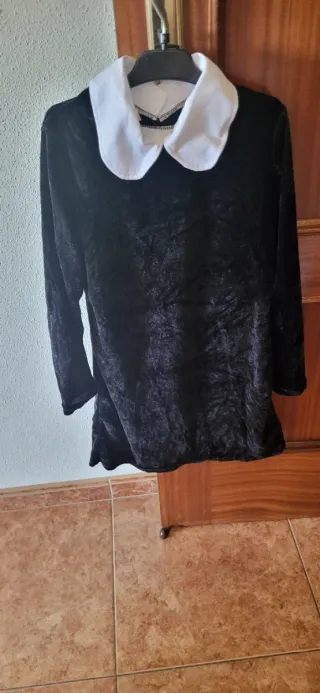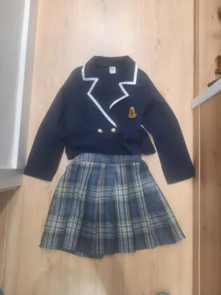 Conjunto de disfraz de colegiala. - Chaqueta azul marino con detalles blancos. - Falda a cuadros en tonos azules y beige.