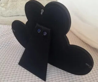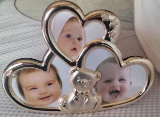 Portafotos con diseño de corazones entrelazados y un tierno osito en el centro. Ideal para guardar tus recuerdos más preciados. - Capacidad para 3 fotografías. - Acabado metálico brillante. - Detalle de estrellas decorativas.