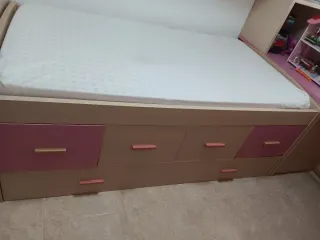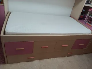 Cama nido con un diseño moderno y funcional, ideal para optimizar el espacio. La cama.de arriba es de 105cm de ancho ppr 190cm de largo, la cama.de abajo es de 90cm de ancho por 190cm de largo. - Estructura principal en tonos madera. - Frontales de cajones en color rosa. - Tiradores a juego. - En el precio va incluido el colchon de la cama de arriba de 105cm de ancho ppr 190cm de largo. - Esta en perfecto estado. - Se entrega desmontada. - No se hacen envios.