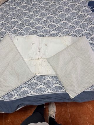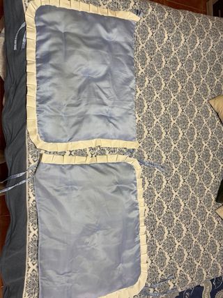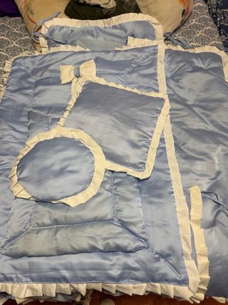 Conjunto de ropa de cuna en un suave color azul satinado, con detalles de volantes blancos. Incluye ; - Cojin cuadrado. - Cojin redondo. - sábana Bajera - colcha - Como una mini colcha para que esté más amortiguado - Dos protectores de cuna pequeños y uno grande En algunas zonas blancas, hay algunas manchas amarillas por haber estado guardado, pero salen sin problema