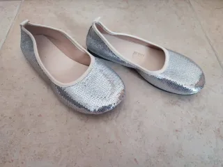 Sandalias cerradas de lentejuelas brillantes en color plata, talla 36. Puestas en un desfile de carnaval durante 3 horas. Puntera anatómica (con espacio para los dedos).