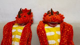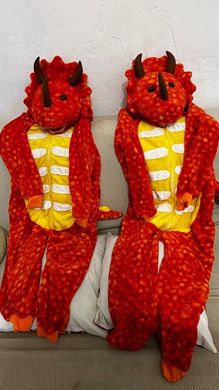 Conjunto de dos pijamas de dinosaurio para niños. - Talla 5 años. 120 - Talla 7-8 años. 130 - Diseño de dinosaurio rojo y amarillo. Los 2 x 18 euros