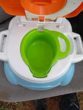 Orinal infantil con diseño divertido y musical. - Asiento naranja con forma de cara sonriente. - Base azul. - Detalles musicales en la parte superior blanca.