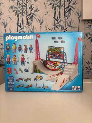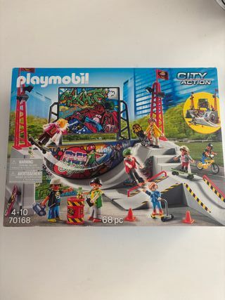 Set de Playmobil City Action 70168, un parque de patinaje con figuras y accesorios. Esta Nuevo PRECINTADO Hago envios por Wallapop - Incluye rampa, figuras y elementos de skatepark. - 68 piezas en total.