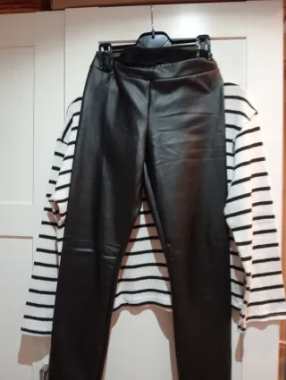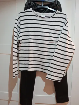 Conjunto de jersey de rayas de Zara y pantalón térmico de Calcedonia. - Jersey de rayas blancas y negras, talla 11/12 años. - Pantalón térmico negro.