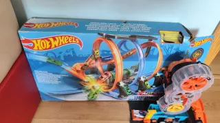 Pista de coches Hot Wheels Corkscrew Crash con múltiples niveles y bucles. - Incluye la pista de carreras. - Diseñada para acción y velocidad. - Marca Hot Wheels.