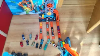 Circuito de garaje para coches Hot Wheels. - Estructura de varios niveles. - Rampas y túneles de juego. - Diseño de color azul y naranja.