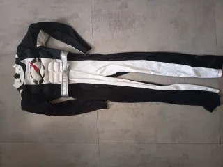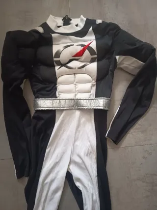 Disfraz de superhéroe con diseño musculoso. - Mangas y parte superior del torso en negro. Esponja imitación músculo - Zona del abdomen y piernas en blanco. - Cinturón plateado. - Detalle de logo rojo en el pecho. - cremallera trasera - 120cm x 35 cm largo x ancho No tiene talla y no se a cual equivale. Por eso están las medidas Bastante usado pero no impide seguir usándolo