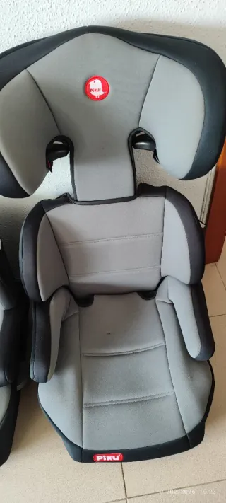 Se venden dos sillas infantiles para coche de la marca Piku. Son cómodas y seguras. - Color gris y negro. - Diseño ergonómico. - Logo de la marca visible.