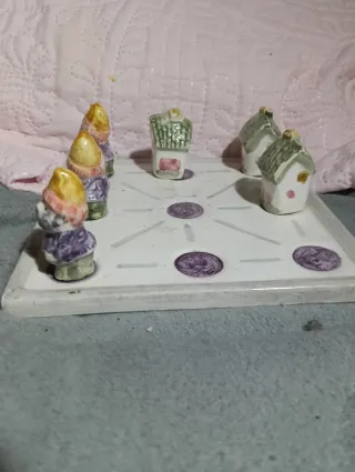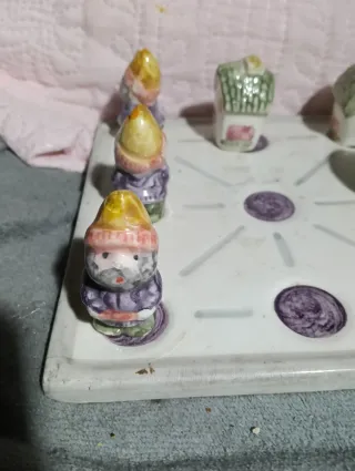 Original juego de mesa de cerámica para el clásico Tres en Raya. Incluye las piezas decorativas. - Tablero de cerámica blanco con diseño. - Piezas de cerámica con forma de casitas y gnomos.