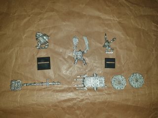 Lo que se ve en las fotos. El estado que se aprecia en las fotos. Piezas de metal, sin pintar (alguna decapada, por lo que hay restos de pintura en recovecos), para el ejército de Orcos y Goblins: * Músico Orco Zalvaje. * Chamán Orco montado en Jabalí. * Goblin dotación Lanzapinchoz. * Pieza de Lanzapiedroz. * Piezas Vagoneta Snotling. SE VENDE LOTE COMPLETO. Para reparar, completar y/o repuestos. Se hacen anuncios con lotes interesados para ahorrar costes de envío. Se envía por Correos (con o sin Wallapop), NO por otra agencia de envíos. Se compra lo que se ve, por lo que NO SE ADMITE DEVOLUCIÓN. Cualquier duda, preguntad.