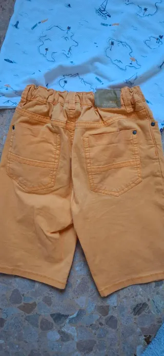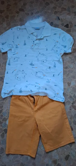 Conjunto de polo blanco con estampado de mapas y veleros, y bermudas de color naranja. Talla 8 años, 128 cm. - Polo de manga corta con cuello. - Bermudas con cremallera y bolsillos, y goma en cintura para ajustar.