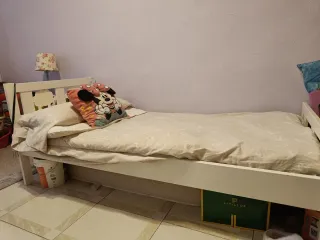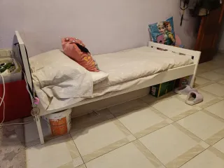 Cama infantil de IKEA, ideal para habitaciones de niños. Su diseño es sencillo y funcional. - Estructura de madera blanca. - Incluye somier y colchón en buen estado
