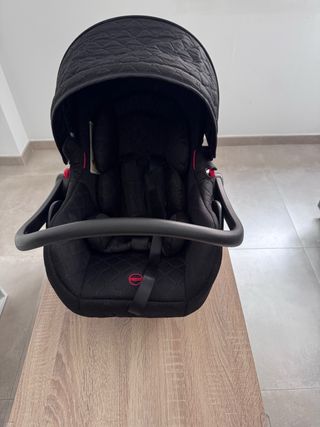 Silla de coche negra con un diseño acolchado y moderno. - Capota ajustable. - Arnés de seguridad de 5 puntos. - Asa de transporte. - Detalle de costuras en rombos.