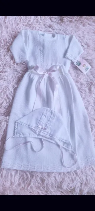 Precioso conjunto para bebé, ideal para bautizo o ceremonia. - Tejido blanco de punto. - Incluye vestido y gorrito. - Detalle de lazo rosa y puntilla.