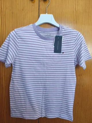 Conjunto de dos camisetas de la marca Tommy Hilfiger. - Talla 8-10 años. - Una camiseta a rayas moradas y blancas. - Otra camiseta de color azul claro.