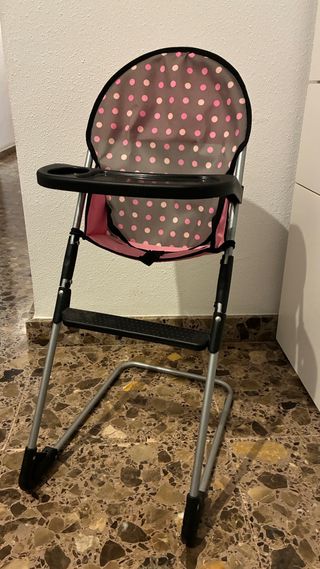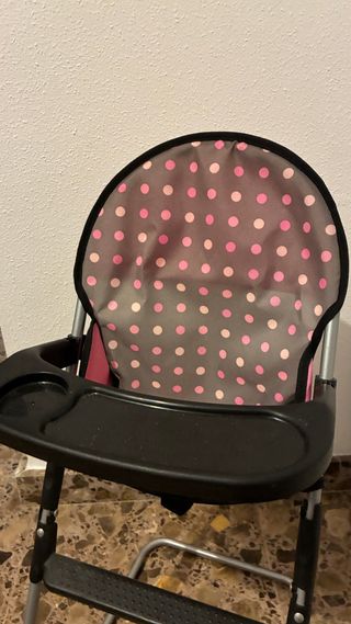 Silla alta para muñecos, perfecta para que tus muñecos disfruten de sus comidas. - Diseño con lunares rosas y grises. - Bandeja de plástico negra. - Estructura metálica.