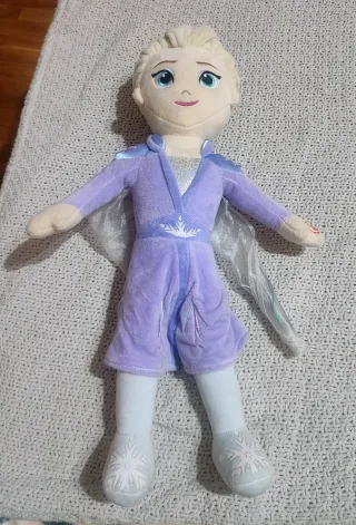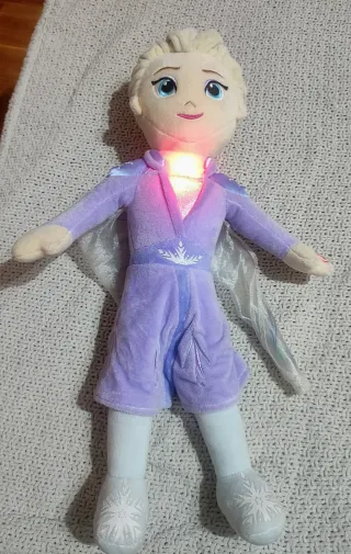 Adorable muñeca de peluche de Elsa de Frozen. Perfecta para los fans de la película. - Vestido morado con detalles plateados. - Capa translúcida. - Zapatos con diseño de copo de nieve. - Con luz al pulsar la mano. - 50cm En muy buen estado. Solo ventas por wallapop.