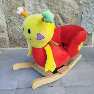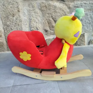 Balancín de peluche con forma de caracol de la marca Juguettos.🪀 - Diseño de caracol amarillo y rojo con antenas naranjas🐌 - Base de balancín de madera. - Tapizado en terciopelo suave. - Incluye cinturón de seguridad y música (pata derecha)🥁