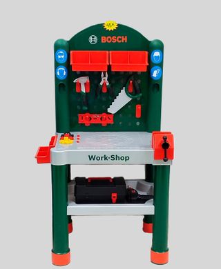 El banco de trabajo con diseño de Bosch con accesorios y ofrece numerosas posibilidades de juego y funciones para los pequeños obreros y obreras La superficie de trabajo con función de aprendizaje, tornillo de banco y numerosas posibilidades de almacenamiento invita a jugar y pensar. Con este banco de trabajo, aprenden a manejar las herramientas de forma segura y ejercitan las habilidades motoras y la imaginación en el juego Fabricado en Alemania Medidas: 50 cm x 37 cm 102 cm; Apto para niños a partir de tres años