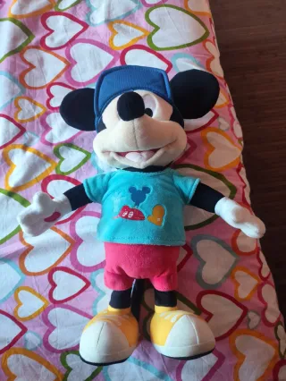 Peluche de Mickey Mouse que habla. - Diseño clásico de Mickey Mouse. - Ropa de color azul y amarillo. - Gorra azul. - Zapatos amarillos. Funciona perfectamente, muy cuidado. Solo tratos por wallapop.