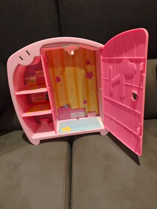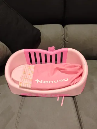 Armario y cuna de juguete para muñecas Nenuco. El armario es de color rosa y tiene puertas abatibles. - Armario con estantes interiores. - Cuna con detalles decorativos.