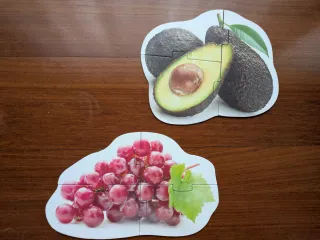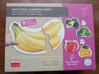 Set de 9 maxi puzles de Akros con temática de alimentos saludables. Incluye imágenes de plátanos, aguacates, brócoli, tomates y naranjas. - 9 puzles individuales. - Diseños coloridos de frutas y verduras. - Ideal para niños a partir de 2.5 años. - Fabricado con materiales resistentes.