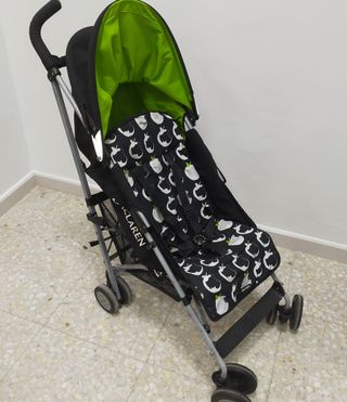 Silla de paseo McLaren en muy buen estado; defecto: pequeña quemadura en la capota, visible en las fotos. Muchos más artículos de bebé en nuestra tienda: cunas, cochecitos, bañeras, carritos... - Arnés de seguridad de 5 puntos. - Ruedas delanteras giratorias.