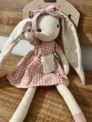 Adorable peluche de conejo de la marca Gamberritos. Es suave y perfecto para acompañar en juegos. - Diseño de conejo con vestido de cuadros rosa. - Incluye un pequeño bolso. - Orejas largas y flexibles. - Lazo rosa en la cabeza.
