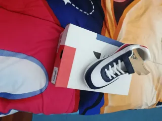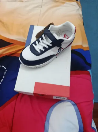 Zapatillas deportivas de la marca Le Coq Sportif. Combinan blanco, azul marino y detalles rojos. - Cierre de velcro y cordones. - Suela de goma. - Diseño moderno.