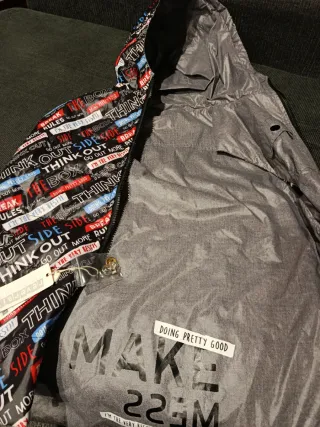 Chaleco reversible con un diseño llamativo y moderno. Una prenda versátil para cualquier ocasión. - Estampado gráfico con texto. - Reversible a gris liso. - Capucha integrada.