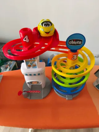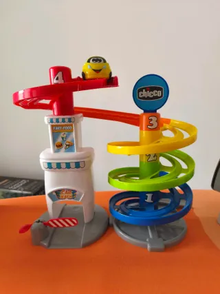 Circuito de coches Parking Turbo de Chicco. Incluye un coche amarillo. - Pista de carreras en espiral. - Estación de lavado de coches. - Zona de comida rápida. Le falta un plastico como el que pone chicco para poner del otro lado.