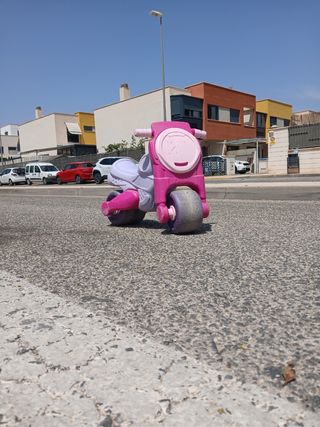 Moto de juguete para niñas, en color rosa y morado. Está en buen estado, aunque tiene algunas marcas de uso. - Perfecta para que los más pequeños se diviertan. - Fabricada en plástico resistente. - Diseño de motocicleta.
