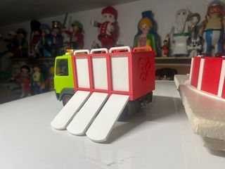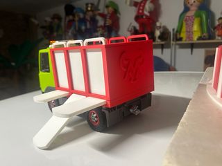 Camión de Playmobil para transportar toros. Se puede poner nombres - Camión de color verde con remolque rojo. - Remolque con diseño de rejas y logo. - Ruedas rojas y negras.
