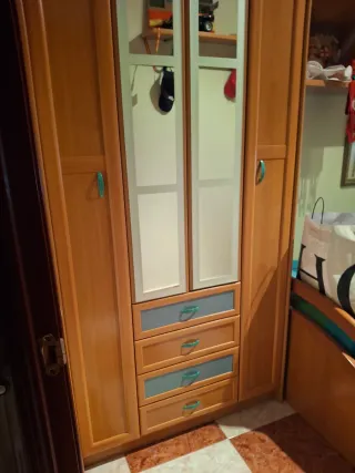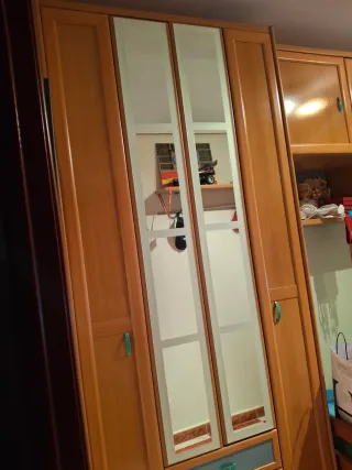 Muebles de dormitorio juvenil en madera. - Armario con puertas de espejo. - Tiradores de color verde. - Cajón inferior de color azul.