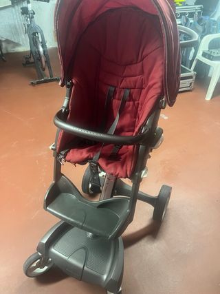 Carro de bebé de la marca Stokke, en color burdeos. - Asiento acolchado. - Arnés de seguridad. - Capota. - Barra de seguridad. - Reposapiés. - Plataforma para acompañante. - Ruedas todoterreno.