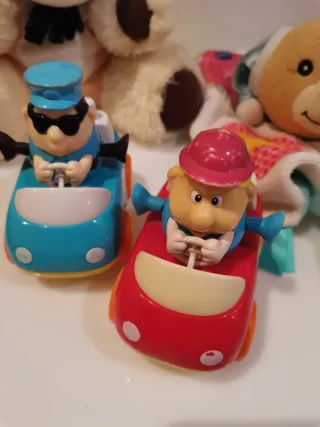 Conjunto de juguetes para bebés que incluye un peluche, mantita musical y dos coches. - Peluche de perro de color beige y marrón. - Dos coches de juguete, uno azul y otro rojo, con figuras. - Manta de apego musical con diseño de animales y cintas de colores.