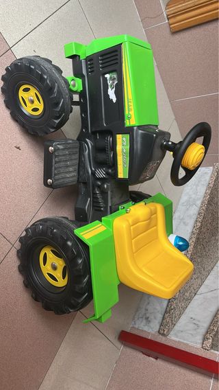 Tractor de pedales para niños, con un diseño llamativo en verde y negro. - Asiento amarillo. - Volante amarillo y negro. - Ruedas grandes de goma negra con detalles amarillos.