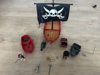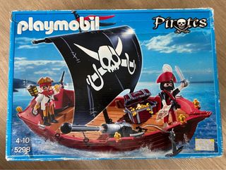 Barco pirata de Playmobil, modelo 5298. - Incluye dos figuras piratas. - Cofre del tesoro y figuras de oro. - Cañón. - Bandera pirata con calavera. 2 barquitos pequeños