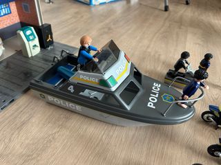Set de Playmobil de la policía que incluye una oficina, un helicóptero y un barco. - Oficina de policía con puertas rojas. - Helicóptero de policía con número 5. - 2 motos de agua - 2 motos de carretera - Barco de policía con detalles en rojo y azul. Munecos , caja fuertea, perros .