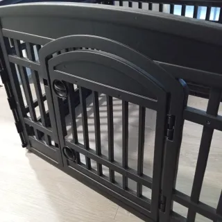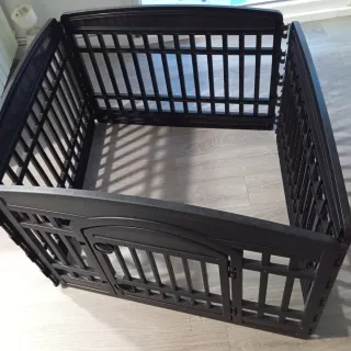 Barrera de seguridad versátil, ideal para niños pequeños o mascotas. Su diseño permite crear un espacio seguro y delimitado. - Construcción robusta en plástico negro. - Paneles interconectados para formar un recinto. - Puerta de acceso con cierre.