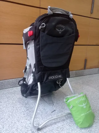 Mochila portabebés Osprey Poco AG en color negro. Ideal para llevar a los más pequeños en tus aventuras. - Diseño ergonómico. - Marco de aluminio. - Incluye funda para la lluvia. - Muy poco uso.
