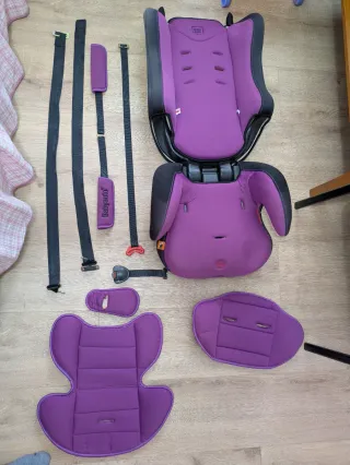 Silla de coche Baby Auto en color púrpura. Incluye cinturones y protectores (estos están desmontados porque se han limpiado a fondo). - Cintas de seguridad negras. - Protectores de hombro acolchados en color púrpura. - Hebillas y enganches metálicos.