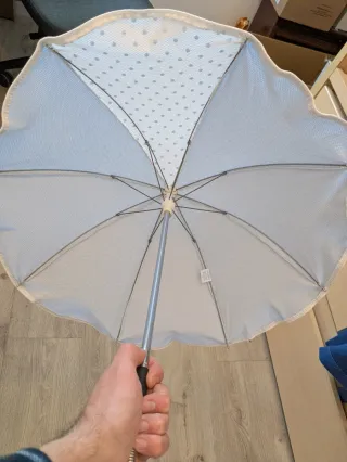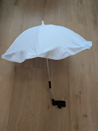 Sombrilla blanca para cochecito de bebé, con un diseño texturizado y un borde blanco. - Mecanismo de sujeción ajustable. - Varilla metálica flexible.