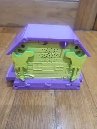 Casa interactiva de la marca Mattel, modelo Pixel Chix. Un juguete divertido con un diseño colorido. Año 2006 Funciona con pilas no incluidas. Trae instrucciones y cable. Tiene luz , sonido e imágenes. - Diseño de casa con techo a dos aguas. - Ventanas cuadradas. - Botones de colores en los laterales. - Base morada con detalles de huesos y logo central.