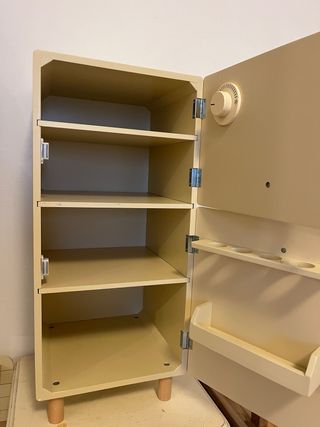 Nevera de juguete de Zara Home Kids, perfecta para completar la cocina de los más pequeños. Su diseño retro en color crema le da un toque encantador. - Diseño vintage. - Color crema. - Tiradores plateados.