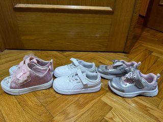 Lote de zapatillas para niña en tonos rosa y blanco. Perfectas para el día a día. Talla 24 - Zapatillas con brillos y lazo. - Zapatillas deportivas blancas con velcro. - Zapatillas plateadas con lazo.