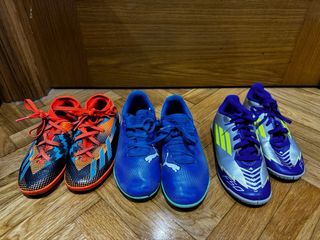 Conjunto de tres pares de zapatillas de fútbol para niño. - Zapatillas azules marca Puma. Talla 30 - Zapatillas plateadas y azules con detalles en amarillo. Talla 30 - Zapatillas naranjas, negras y azules con diseño deportivo. Talla 29